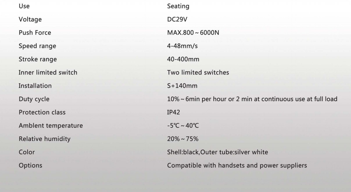 本產(chǎn)品已通過CE、UL、PSE、ISO9001認(rèn)證,它有一個新穎的外觀和制作精良,噪音小,操作簡單,讓它成為暢銷國內(nèi)外,被廣泛用于電動沙發(fā)、醫(yī)療床、手術(shù)床,按摩椅等。