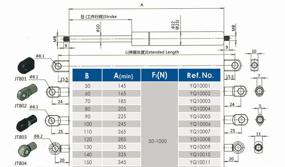 注:由于氣彈簧是非標(biāo)準(zhǔn)的,以上僅為型號的一部分。我們可以根據(jù)客戶的要求定制。