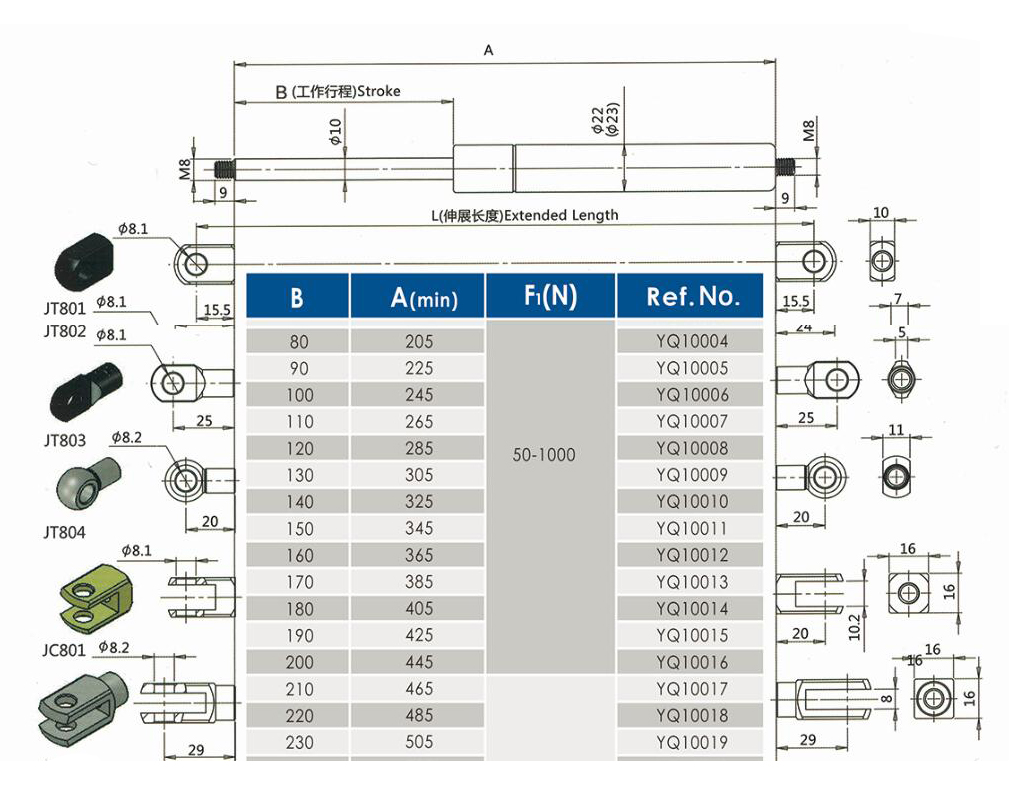 注:由于氣彈簧是非標(biāo)準(zhǔn)的,以上僅為型號(hào)的一部分。我們可以根據(jù)客戶的要求定制。