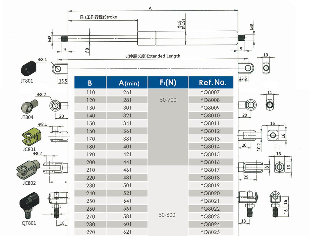 注:由于氣彈簧是非標準的,以上僅為型號的一部分。我們可以根據(jù)客戶的要求定制。