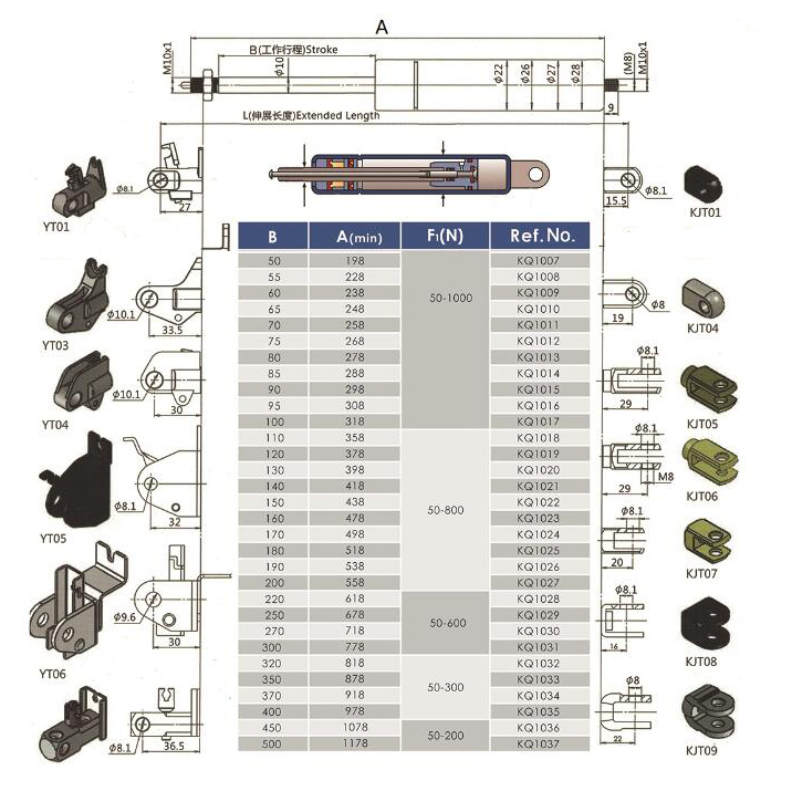 注:由于氣彈簧是非標(biāo)準(zhǔn)的,以上僅為型號(hào)的一部分。我們可以根據(jù)客戶的要求定制。